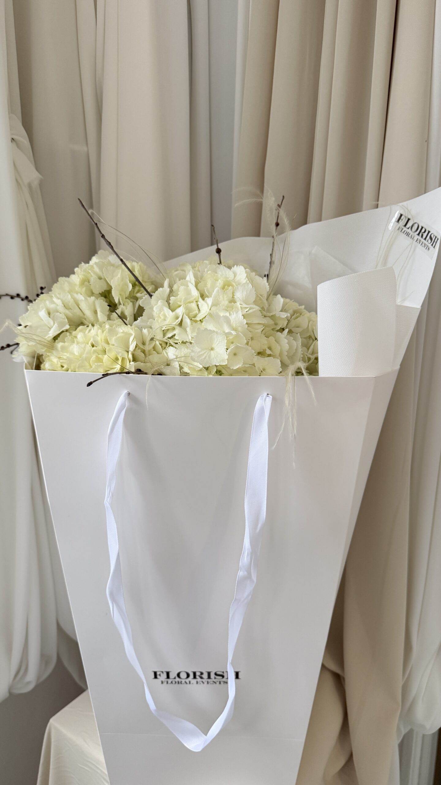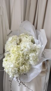 Buchetul contine 9 hortensii albe. Se poate realiza si din hortensii roz, peach, albastra sau mov.